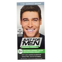 Just for men original formula men's hair colour, dark brown (pack of 3) about the product: This wash out hair color is designed for both blondes and brunettes and is suitable for all hair types so everyone can get in on the fun. Just for men's touch of gray dye comes in numerous colors and a nifty comb applicator to help target your roots. It's simple to use—leave it on for five minutes and shampoo out—and won't leave dark. Shower, shampoo, get rid of grey hairs — it's now that easy.